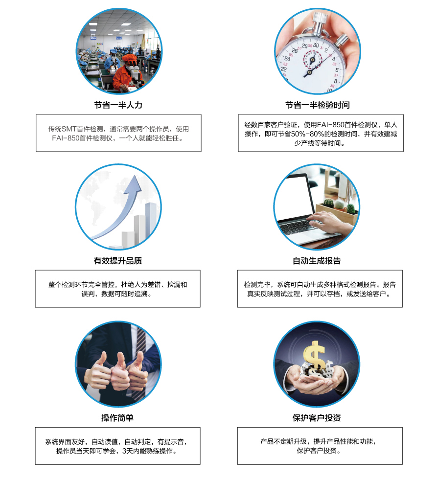 当今SMT电子工厂,多机种、小批量、换线频,使得首件检测的任务越发繁重。传统的SMT首件检测方法,不仅浪费人力,效率低下,整个首件检测过程缺乏管控,品质难以得到保证。针对此难题,深圳市蓝眼科技有限公司首创了SMT首件检测仪,通过不断升级优化,现已研发出第四代首件检测仪FAI-850,具有以下显著优势: